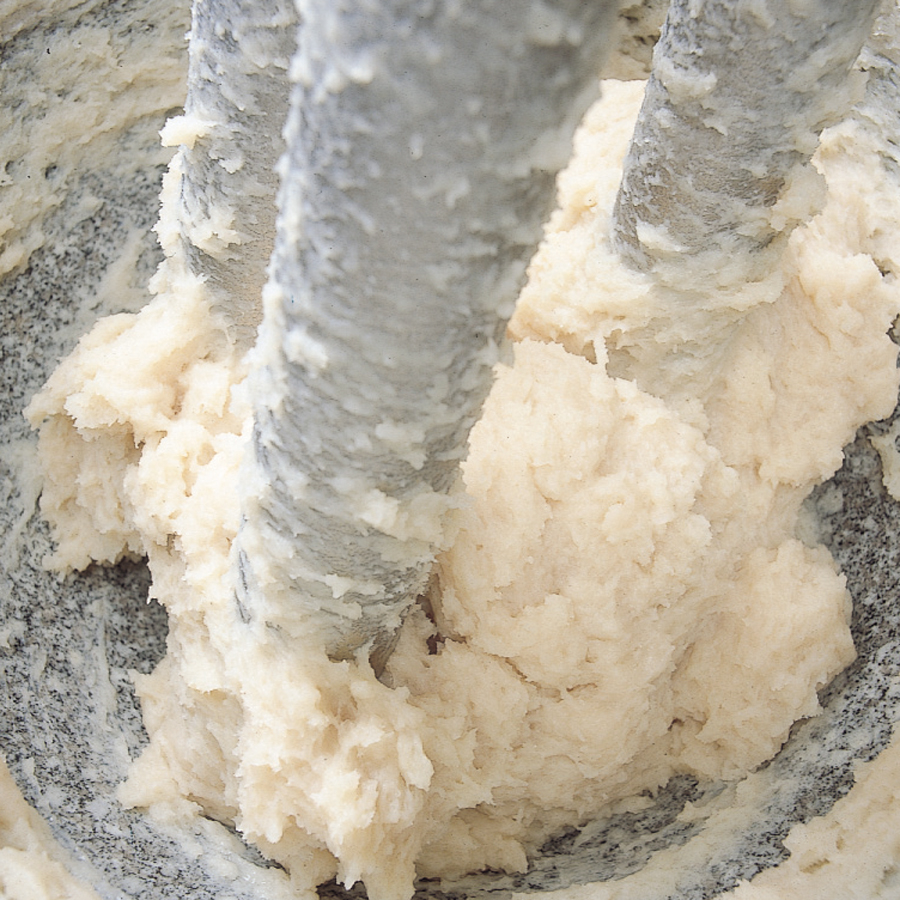 きめ細やかなすり身を作るためには、臼で擦りあげる事が必要ですが、すり身は温度に敏感なため、温度の上がりにくい石臼を使用して擦っています。