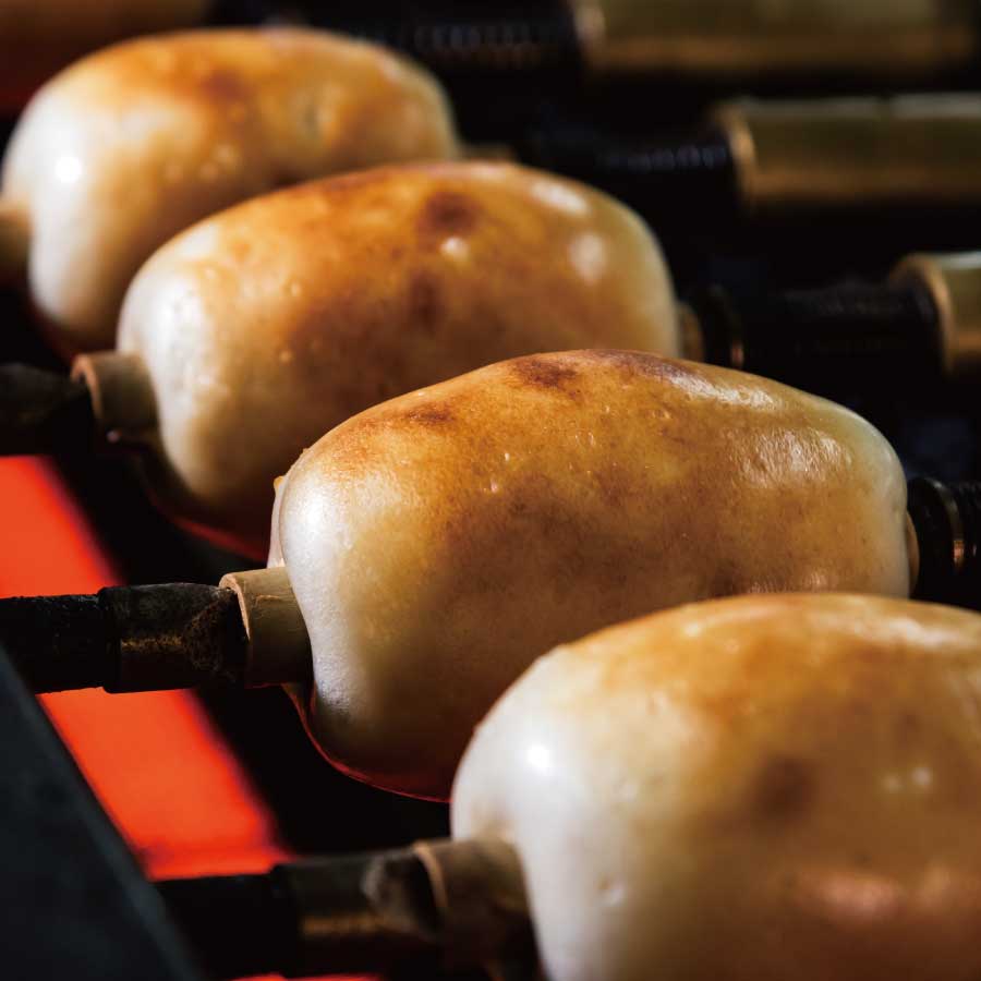 焼く時に皮が破れないよう、ちくわに穴をあけ回転させながら焼く事の出来るちくわ専用の焼き機を導入しています。