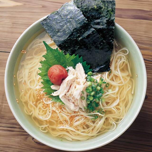 藻塩を使用したスープはまろやかな口当たりで、スッキリとヘルシーな味わいです。水と海藻だけの旨味が凝縮した藻塩は、塩辛さに尖ったところがなく口当たりが大変まろやか。その『藻塩』を100%使用した『藻塩ラーメン』は、あっさりしているのに、潮の香りが深い味わいを感じさせてくれます。麺はあっさり味によく合う自家製の丸細麺を使用しています。